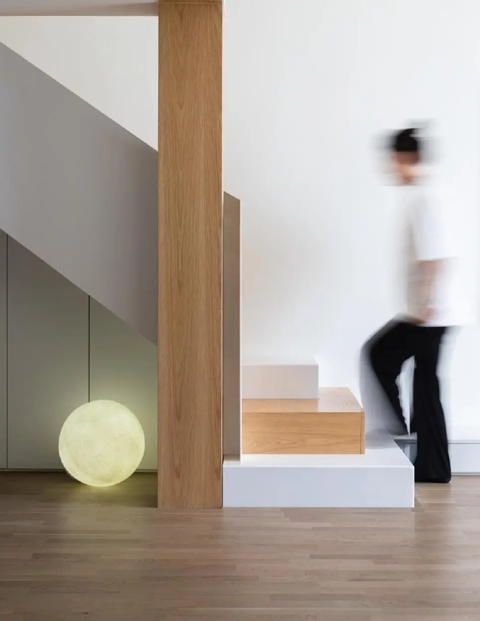 一来拥有了大量的储物能力,哪怕收纳50-60双鞋子,也可以轻松得到满足。二来楼梯旁边的立柱刚好代替了玄关隔断的作用,让入户动线有了迂回。