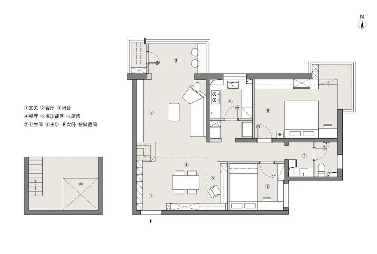 3、餐厅向次卧扩大,延伸出一块多功能区。