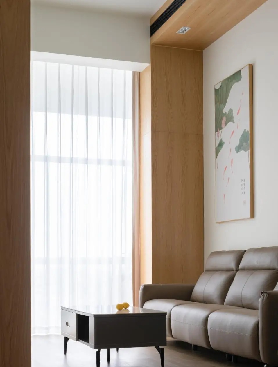 沙发墙一角和顶面,采用同款木饰面做包裹处理。一来平衡了基调,让留白空间不会太过冷峻;二来也让视觉有了更多的延伸。