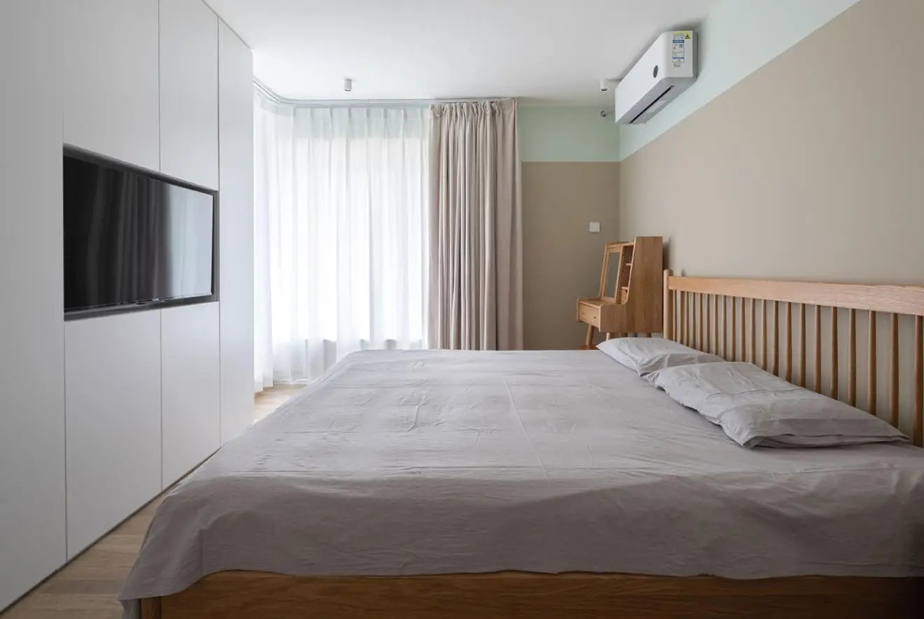 衣柜放在了床尾处,并以原木+白色的方式,增加了空间层次。而轻柔的纱帘选择,也有效过滤了阳光,让氛围更加柔和。