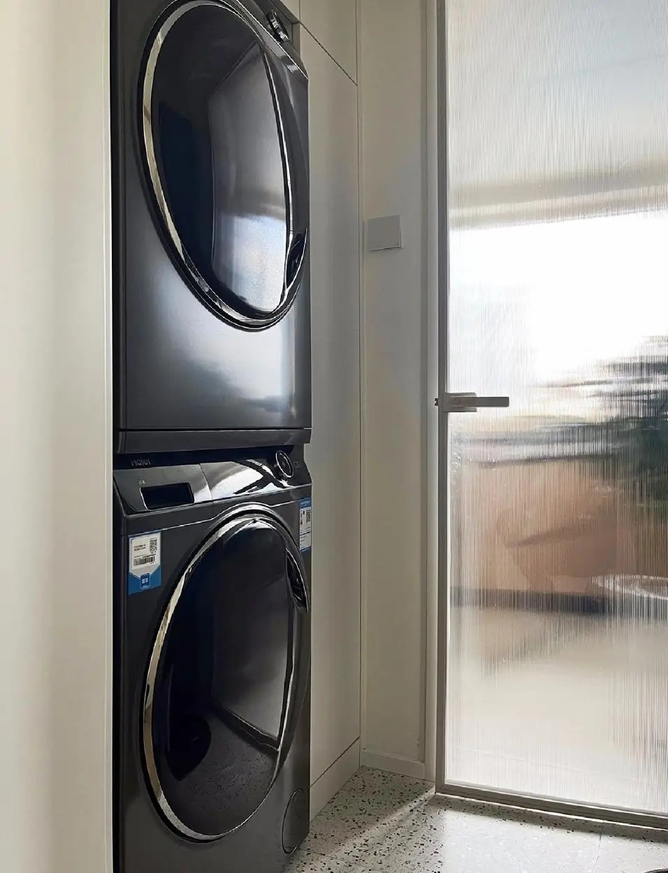 厨房门洞在原有的空间基础上,进行了内退处理,继而释放出冰箱、洗烘机的空间需求。当然,在厨房安装玻璃门隔断的情况下,这种处理方式,也能提升生活效率。