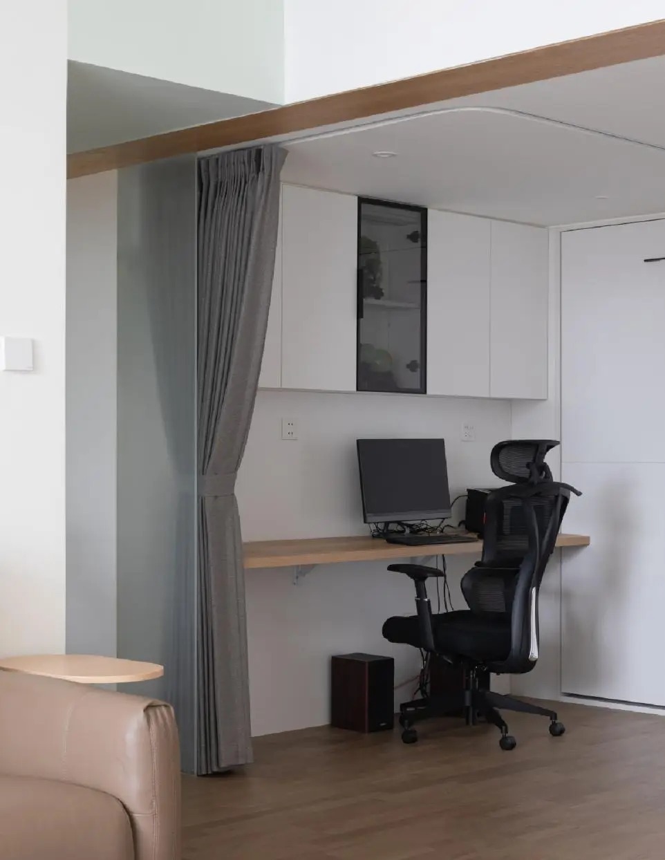 利用部分次卧面积打造的办公区,是男主的专属功能区。虽说是开放式结构,但在顶面预留窗帘轨道后,却也在日常中做到了开合自如。而隐藏在侧面衣柜里的墨菲床,则充分考虑到了老人过来小住的需求。