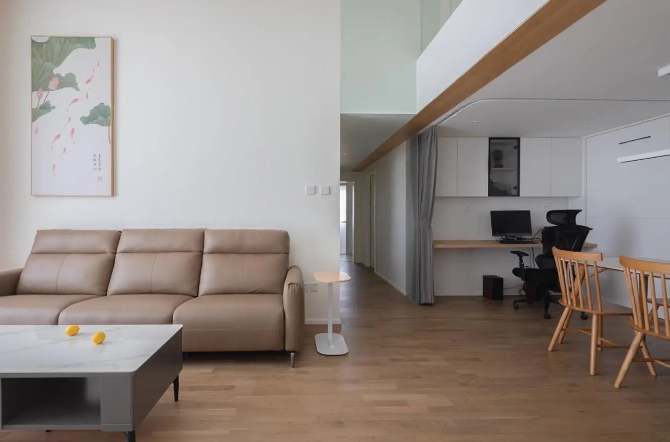 客厅看向功能区视角,扩大后的餐厅整合了用餐、办公、客房功能,以应对不同的生活场景需求,让空间更具成长性。