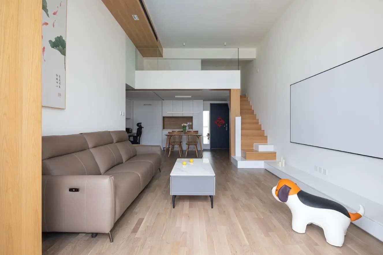 1、客厅保留4米层高,并以极简的方式,让空间表现更加敞亮。