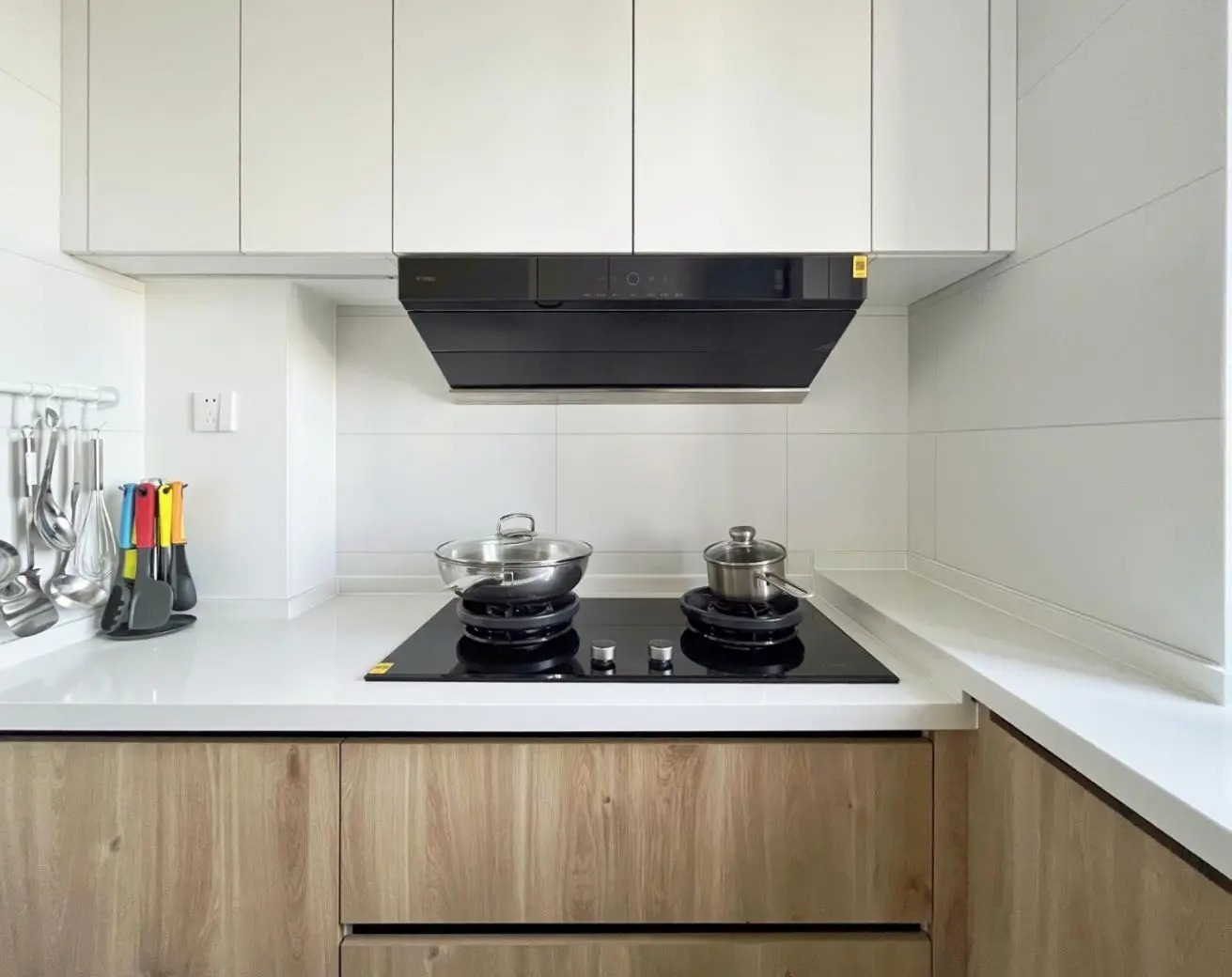 厨房内部做了最实用的U型橱柜布局,并通过高低台面的方式,强调了操作舒适性。而白色的上柜,原木色的下柜,也都在与外面呼应的情况下,产生了更多的烟火气息。